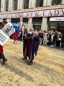 This year was the First Lady Mayor’s Show as Dame Susan Langley, the third lady to occupy the office, has styled herself as Lady Mayor, and it was a great joy and a huge privilege to be part of the Show. As usual the show, which is the longest and least rehearsed civic procession in the world, was an eclectic mix of the traditional and the wacky – livery companies, Gog and Magog, and representatives from institutions and organisations in the City. The floats represented some of the Lady Mayor’s interests, including for the first time a Premier League football team in the form of West Ham, as well as her mother company, the Insurers.